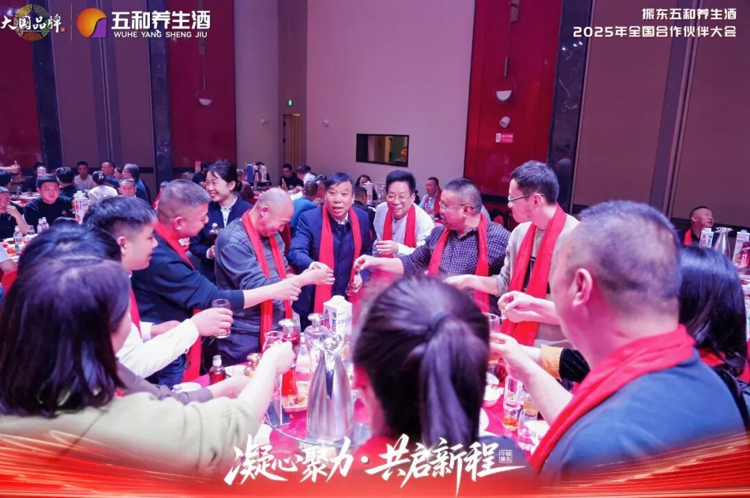 随着会议落下帷幕,现场氛围并未冷却,而是悄然升温——一场以"健康"为底色的晚宴拉开帷幕,来自全国各地的合作伙伴们在“五和养生酒”的醇香中举杯共饮,觥筹交错之际,分享着对产品的体验和理解,交换着经验和资源。
