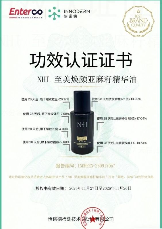 中科中创作为深耕亚麻籽产业超过十余年的国家级高新技术企业,率先将亚麻籽全籽应用的科研积累延伸至护肤领域。依托十余项国家发明专利及完整的原料、研发与临床验证体系,让NHI每肤季品牌不仅实现了亚麻籽从食品到护肤的价值跨越,更通过独家渗透技术,推动以油养肤进入“高效吸收、靶向修护”的新阶段。