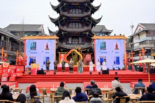 开肆仪式上,“鱼凫荐酒”情景剧不仅重现了鱼凫王“教民农耕、亦善酿酒”的传说,更重构了温江历史IP的当代表达。剧中,成特酒厂、丰收精酿、巨龙生物三家本土品牌代表化身“荐酒官”登台,将古蜀酒文化与当代酿造技艺巧妙连接,以民众喜闻乐见的方式,生动演绎了从传说到佳酿、从历史到产业的活态传承。