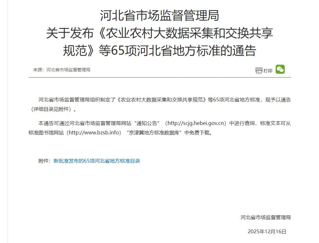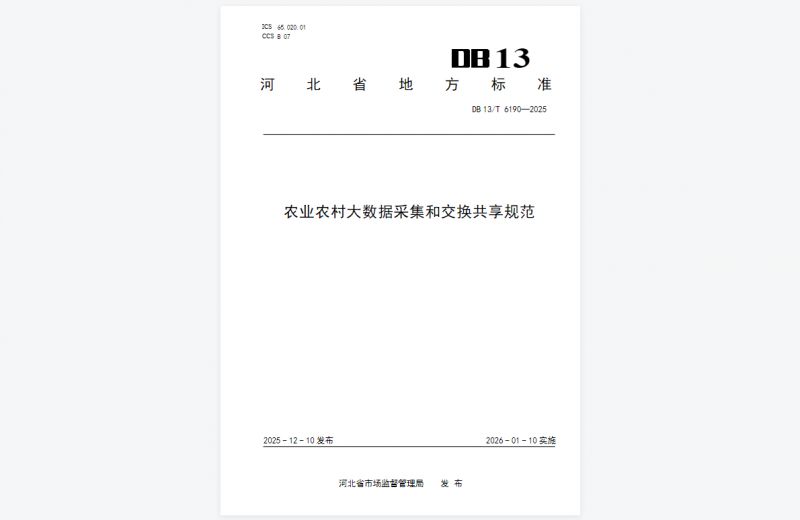 近日,河北省市场监督管理局正式发布2025年第24号通告,由世窗信息联合河北省农业信息中心、河北农业大学共同编制的《农业农村大数据采集和交换共享规范》(DB13/T6190-2025)成功获批省级地方标准,将于2026年1月16日正式实施。这一标准的落地,不仅填补了河北省农业农村大数据领域的标准空白,更标志着我省农业农村大数据建设告别"数据孤岛"时代,迈入标准化、规范化、集约化发展的全新阶段,为全国农业数字化转型提供了可复制、可推广的"河北样本"。