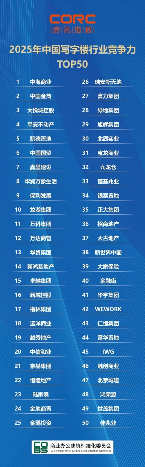 从整体上榜格局来看,写字楼TOP50榜单,央企以绝对优势包揽前三。中海商业蝉联第一,中国金茂与大悦城紧随其后,三者共同构成我国商业办公行业的最强矩阵。这三家企业不仅排名前三,同时也是今年竞争力表现增速最快的头部企业。中海商业长期深耕COOC中海商务领域,覆盖范围广且服务支持体系日渐成熟;中国金茂则凭借布局优势和专业服务巩固市场地位;而大悦城依靠优质商业业务与行业顶尖的品牌信誉度,继续维持其在消费者中的高度粘性。