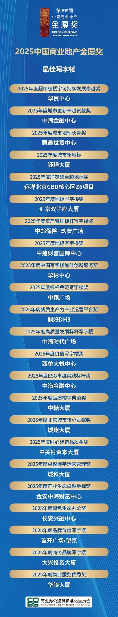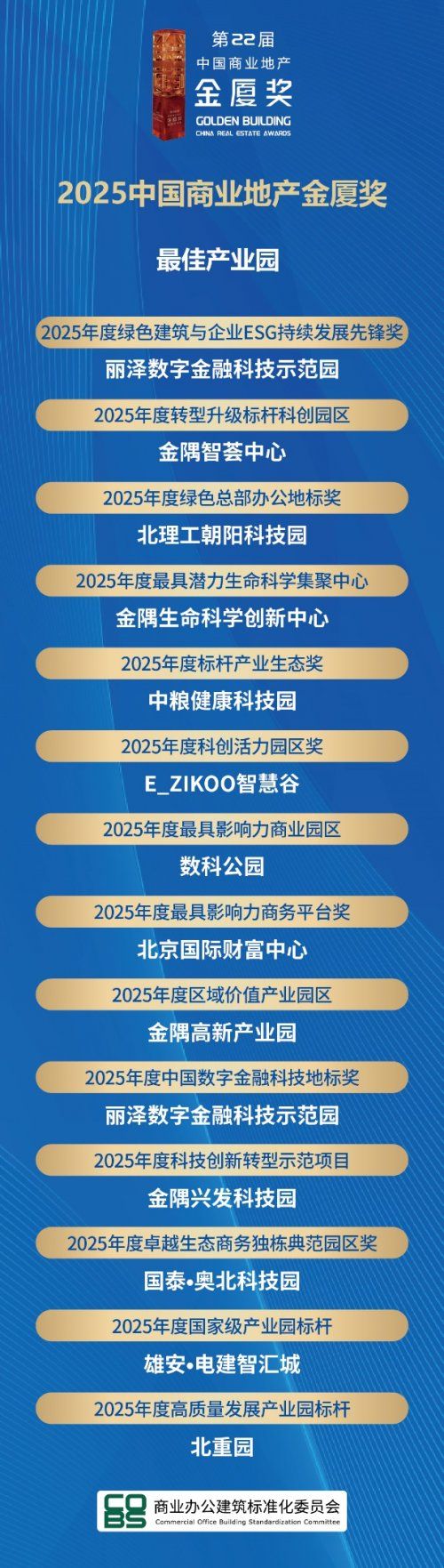 值得关注的是,“2025中国写字楼产业园行业竞争力100强”榜单首次将行业竞争力系列(TOP100榜单)和年度影响力系列(中国商业地产金厦奖)分开排序,进一步提升了排名的严谨性与专业性。