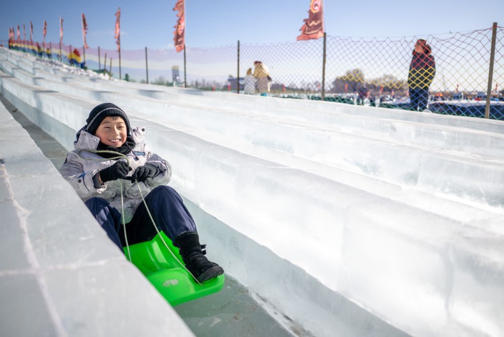 一名儿童在玩滑冰梯。新华社记者 连振 摄