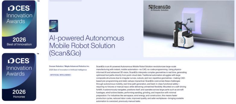 2026 年国际消费电子展(CES)的聚光灯聚焦拉斯维加斯会展中心,工业机器人 AI 领域诞生焦点时刻 —— 源自和意精工的 AARS(自主自适应机器人系统)技术,携手合作伙伴斗山机器人(Doosan Robotics),一举斩获 CES 2026 “人工智能” 类别 “最佳创新” 奖,同时入选 “机器人” 类别创新奖荣誉名单,成为本届 CES 唯一在双核心赛道获奖的工业机器人智能化技术!