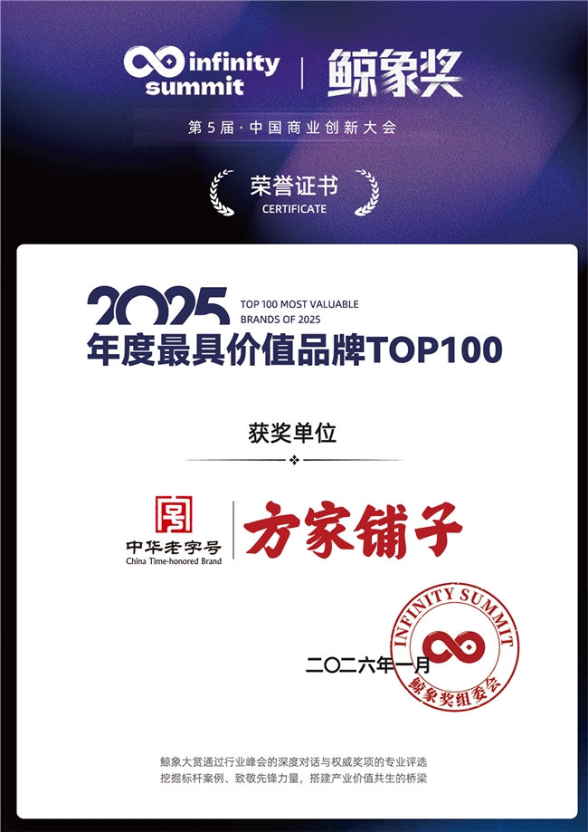 从前瞻战略到协同落地,方家铺子走出了一条老字号可持续的价值进化路径,也印证了其在鲸象大赏“年度最具价值品牌TOP100”评选中的实至名归。