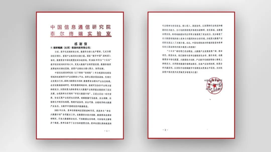 福昕鲲鹏凭借扎实的技术实力与积极的行业担当,收获了中国信通院发来的感谢信!信中对福昕鲲鹏在多维度的辛勤付出与鼎力支持给予高度肯定,涵盖数据安全技术创新、数据要素流通标准制定、行业大数据联合攻关、可信数据生态构建、专家智库支撑等关键领域,既是对我们过往工作的认可,更是对未来前行的鞭策。