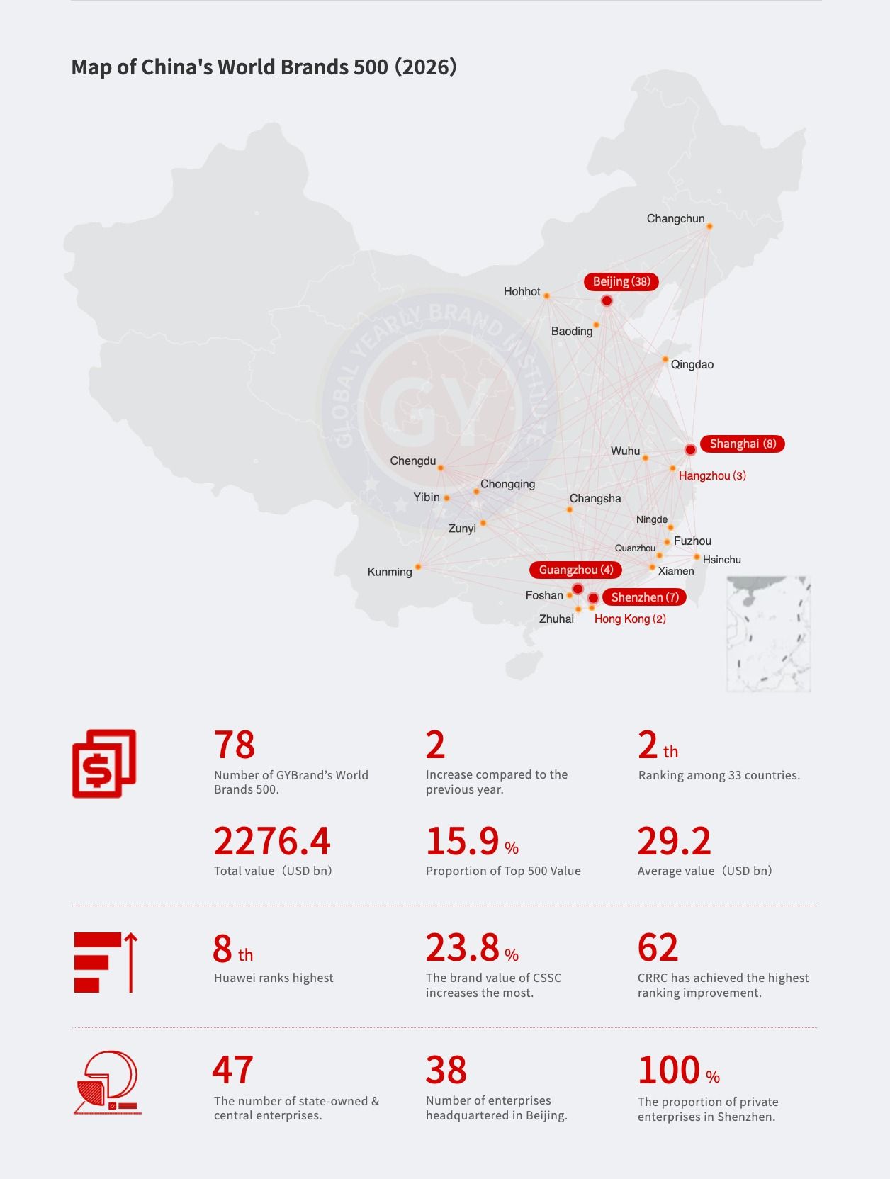 从2026年GYBrand世界品牌500强中国企业分布地图可见,头部城市已成为中国品牌高质量发展的核心引擎。今年中国(含港台地区)共有78家企业上榜,稳居全球33个国家中的第2位(较去年增加2家);上榜品牌总价值达22764亿美元(占了全球榜单的15.9%),单品牌平均价值约292亿美元,规模和质量同步提升。