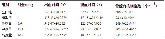 气血双虚症的小鼠统摄血液能力较差,导致出、凝血时间延长,同时骨髓有核细胞造血功能降低,灌胃亲亲酒后的小鼠出、凝血时间分别最低可降46.70%、57.39%,骨髓有核细胞数量最高可增加147.67%。表明亲亲酒可明显改善小鼠气血双虚症。