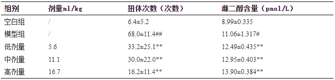 扭体实验中,患痛经小鼠身体扭动次数越多,表示痛经越严重。灌胃亲亲酒后的小鼠扭体次数显著降低(降低了76.18%),表明亲亲酒可缓解小鼠痛经。