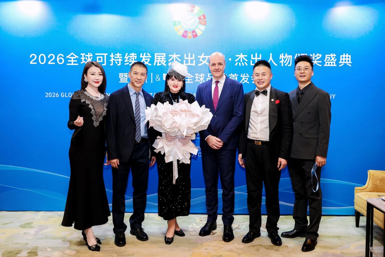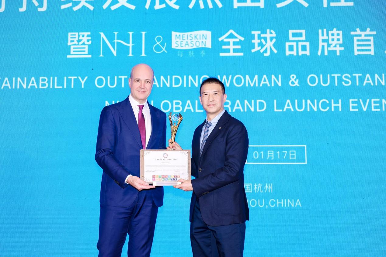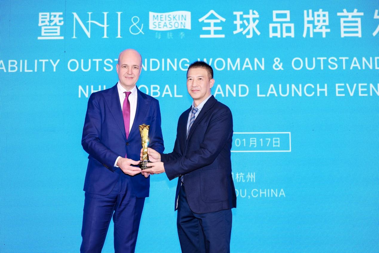 发布会现场,NHI 每肤季凭借其对行业可持续发展与经济价值的双重贡献,获得了国际市场与经济界的高度认可。约翰先生以全球经济和科技创新发展的战略视角,为中科中创董事长、NHI每肤季品牌创始人--黎坚先生,以及浪莎集团董事长战略顾问--史建树先生颁发了“全球可持续发展人物杰出奖”,以表彰他们通过品牌创新,为企业与行业带来的可持续增长范式!