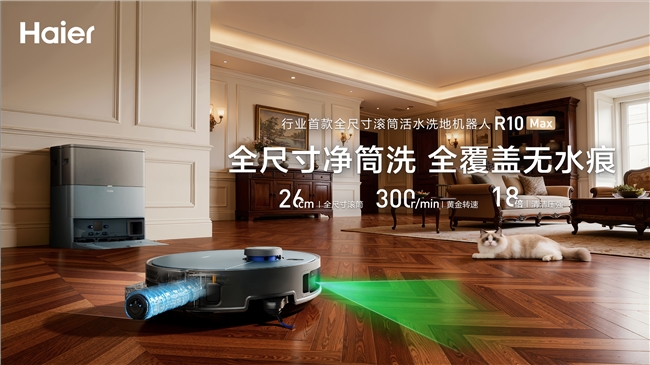 此次被列为京东爆品的海尔全尺寸滚筒活水洗地机器人含光R10Max,是一款集行业顶尖AI技术与高效清洁能力于一身的革命性产品。其采用的26cm全尺寸滚筒,16孔活水喷淋,可高效清洁无轮印,单次清洁面积提升44%,全域覆盖提升全屋清洁效率,大户型也能轻松应对;而“先洗净滚筒拖布,刮除多余水分再拖地”的这种净筒洗地的模式,则可以避免污水痕残留,即擦即干无水渍;搭配300r/min的转速和18倍压强的增压擦地,真正做到顽渍一遍净无残留。