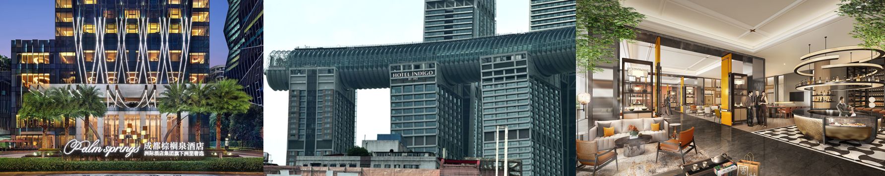 从左至右依次为:洲至奢选成都棕榈泉酒店、重庆朝天门英迪格酒店、北京江西大厦天坛voco酒店