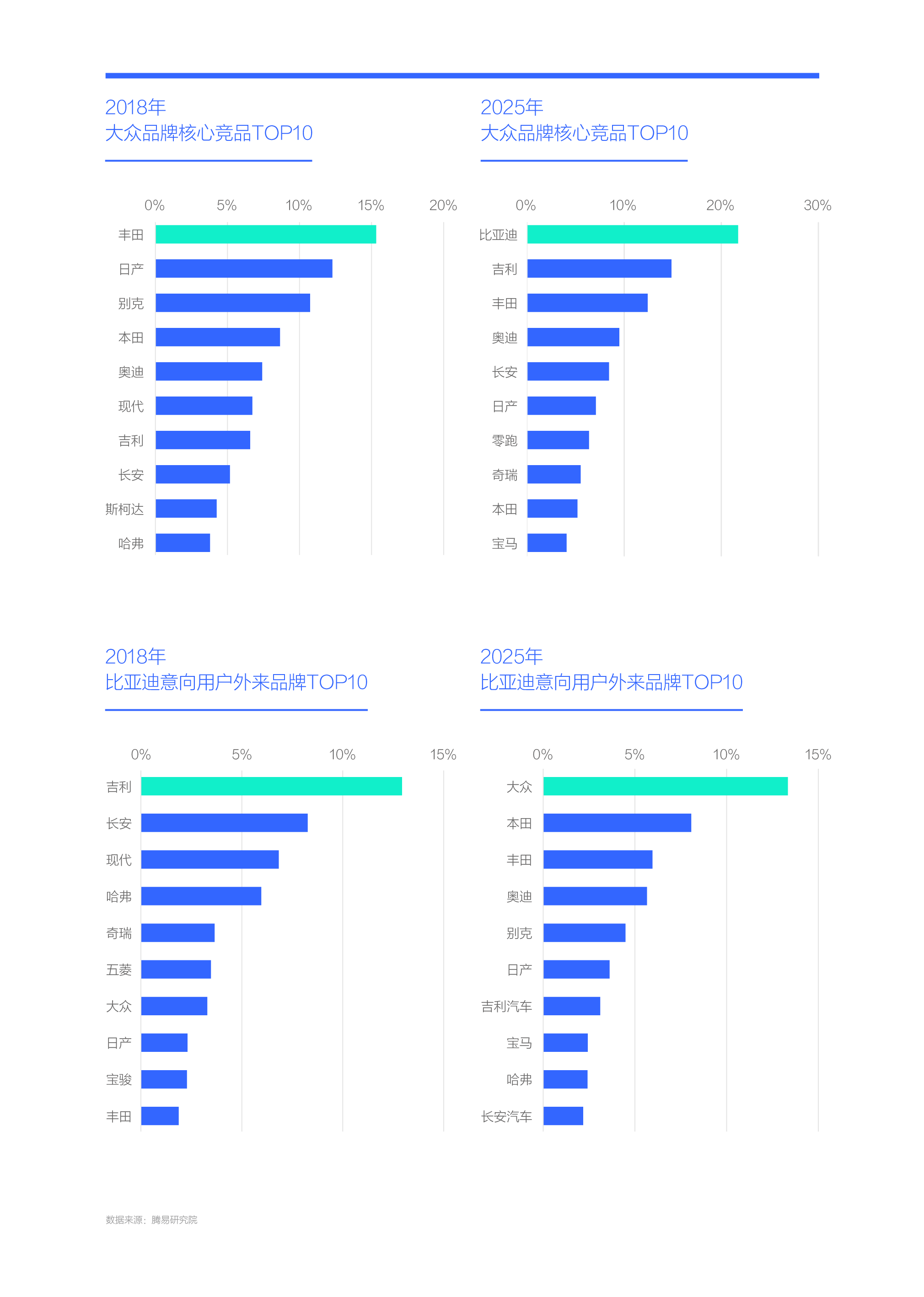 在小电动未强势崛起之前,海外品牌几乎不带中国品牌玩,两大阵营各玩各的。2018年大众的最大竞品为丰田,其次是日产、别克、本田和奥迪,TOP5全为海外品牌。中国品牌很难向海外品牌渗透,2018年比亚迪的意向用户外来品牌最多的是吉利,其次是长安,第三虽是现代,但第四、第五和第六分别为哈弗、奇瑞和五菱,都是中国品牌。2020年起,随着中国品牌小电动的强势崛起,海外品牌的传统竞争格局遭遇重创,中国品牌的威胁越来越大。2025年大众的最大竞品为比亚迪,其次是吉利、丰田、奥迪和长安,中国品牌占了大众竞品TOP5的三席,意味着大众的任何市场举措,首先就得考虑能否拿捏中国品牌。中国品牌不仅成为海外品牌的强劲对手,而且正大肆抢夺海外品牌的老用户,尤其是“他”。2025年比亚迪的意向用户外来品牌用户最多的就是大众,其次是本田、丰田、奥迪与别克,TOP5全是保有量巨大的海外品牌。这些用户可不是全冲着比亚迪的小电动来的,还有汉、唐等更高端产品。上述演变间接说明比亚迪品牌的高端化迫在眉睫,在充分总结2025年夏与唐L成败得失的基础上,2026年大唐(最终车名尚未确定)、大汉(最终车名尚未确定)、海狮08等新一批高端产品不容闪失;