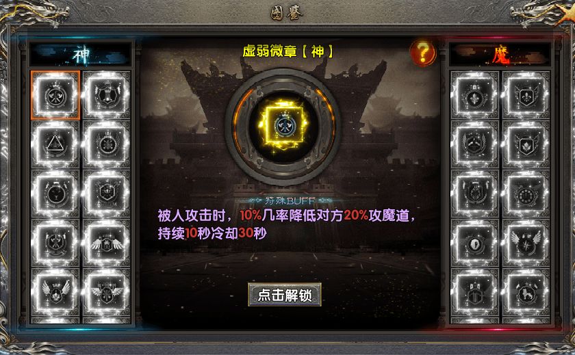 游戏中还有神魔徽章系统,同样可以提升双防、攻魔道、生命值的基础属性加成,还有88%的全属性加成,另外还有特殊的buff效果:神徽章主打防御,魔徽章主打削弱对手,也有部分防御buff,两个徽章一起戴上,等于是双倍提升了自己的实力。和命格一样,徽章也可以在图鉴系统里进行收集和替换,收集徽章还能额外再得到属性加成奖励。