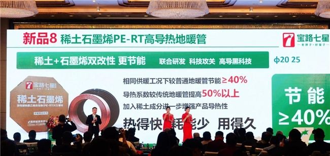 仪式上,宝路七星管业有限公司推出了创新管道产品——稀土+石墨烯地暖管,这标志着中国稀土技术在全球范围内领先应用于新型塑料管道行业,开启了“稀土+石墨烯管道”融合创新的新征程。