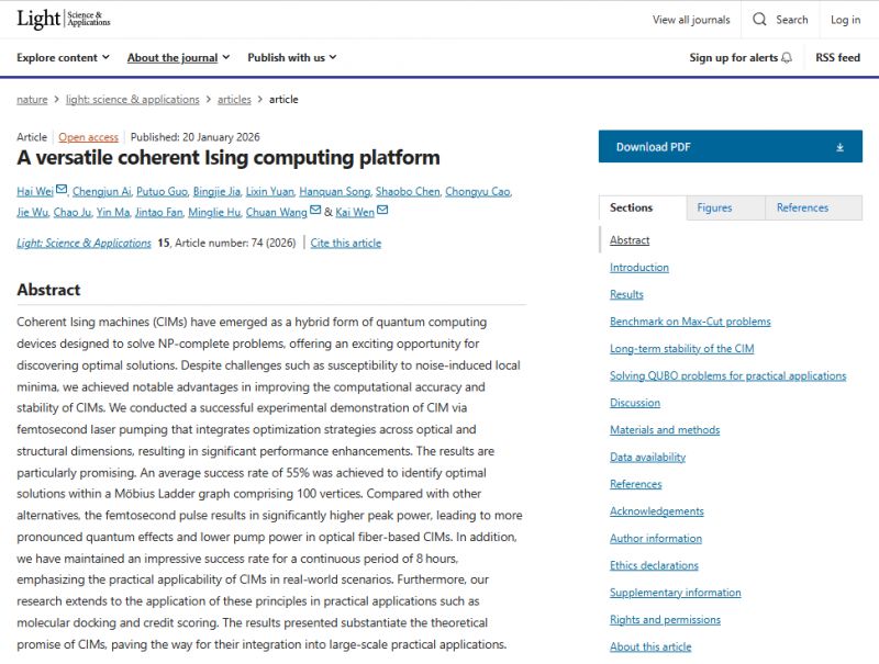 2026年1月20日,北京玻色量子科技有限公司(以下简称“玻色量子”)联合北京师范大学、天津大学在光学领域殿堂级期刊《Light:Science and Applications》(LSA)上发表了一篇以《A versatile coherent Ising computing platform》为题的学术论文。玻色量子CTO魏海博士、Chengjun Ai、Putuo Guo、 Bingjie Jia、Lixin Yuan为论文共同第一作者,玻色量子创始人&COO马寅为论文联合作者,玻色量子创始人&CEO文凯博士、魏海博士、北京师范大学王川教授为论文的共同通讯作者。
