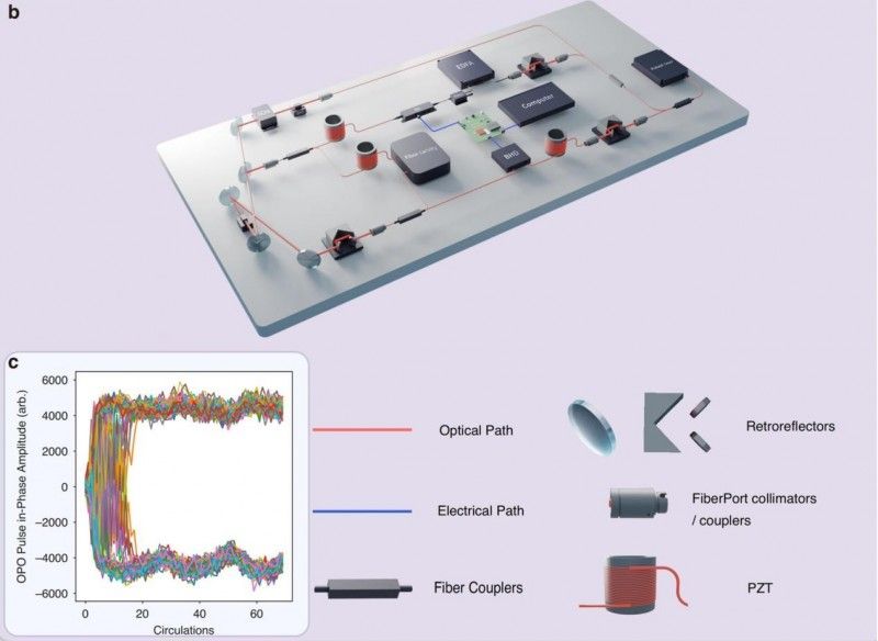 该研究通过飞秒激光泵浦技术,成功实现“空间光路+光纤光路”的异构光路体系架构的优化策略整合,大幅提高相干光量子计算机的量子优越性,使得相干光量子计算机在量子计算性能、系统稳定性和实际应用三个维度实现了标志性突破。
