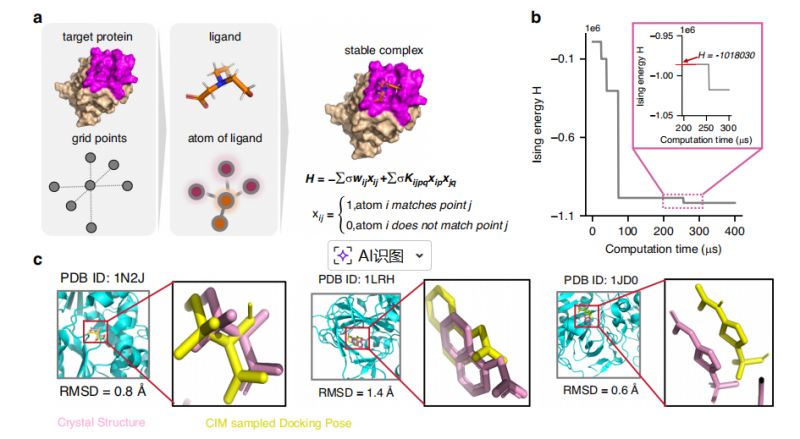 c图:采样对接构象(黄色)与晶体结构构象(粉色)的1N2J、1LRH和1JD0对比。这三种分子的均方根偏差(mRMSD)值分别为0.8Å、1.4Å和0.6Å,均低于2Å,表明相干光量子计算机在分子对接计算中的有效性。