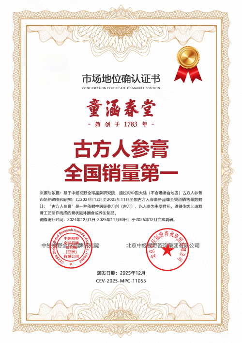 作为长期聚焦消费趋势与产业动态的市场研究机构,中经视野全球品牌研究院近日发布一项关于传统滋补品市场的调研成果:童涵春堂“古方人参膏”在2024年12月至2025年11月期间,以全渠道销售量领先优势,成为全国古方人参膏品类销量第一品牌。这一结果并非单纯数字的堆砌,而是在药食同源理念加速普及、消费者对“真材实料”愈发敏感的背景下,一个拥有240余年历史的老字号,如何用“古方+现代信任机制”重新定义日常养生的答案。