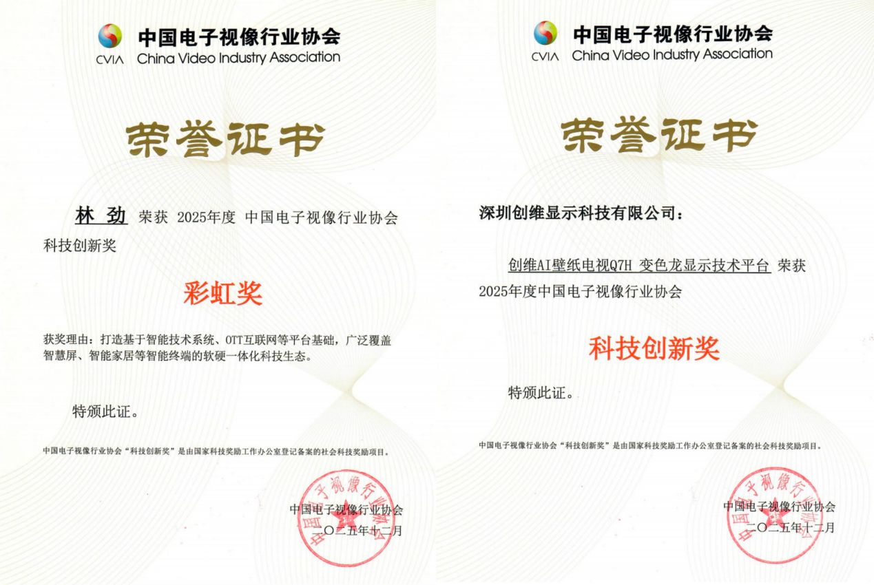 在第二十一届中国音视频产业大会(AVF)暨“科技创新奖”颁奖礼上,创维集团迎来个人荣誉与技术成果的双重加冕:集团董事会主席林劲凭借在行业内的卓越成就与突出贡献,荣膺音视频领域个人最高奖项——「中国电视视像行业协会科技创新奖?彩虹奖」;与此同时,创维AI壁纸电视Q7H搭载的「变色龙显示技术平台」实力出圈,斩获了中国音视频产业的最高奖项——「中国电子视像行业协会·科技创新奖」。