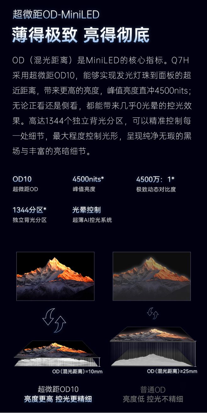 为优化亮度表现,创维Q7H采用行业断档领先的超微距OD 10技术。“OD”值即背光灯珠到均光板的距离,距离越近光线越聚拢,就像是用手电筒照在墙面上,靠近墙面后,光线会从发散变为直射,在提升亮度的同时有效抑制光晕,优化画面带来超高对比度。