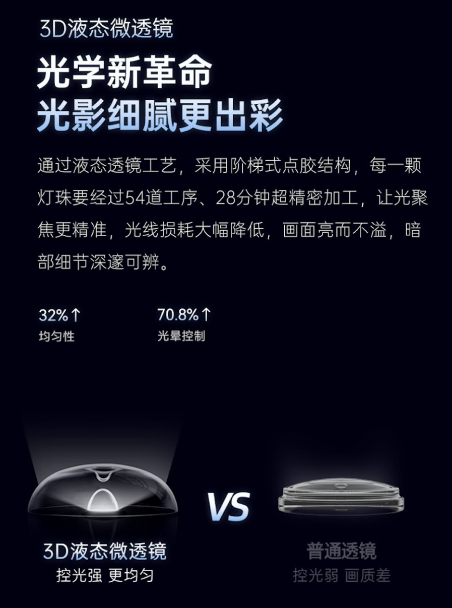 针对超微距OD10技术可能产生的屏幕“颗粒感”问题,创维自研「3D液态光学微透镜」进行适配。这款形似倒扣碗的光学组件,中间的凹陷部分负责将每个灯珠经过超微距OD 10聚拢后的直射光在合适的范围内均匀散开,与相邻灯珠光线自然融合,实现聚光与均光的平衡统一,让高亮度与背光均匀性二者兼得。