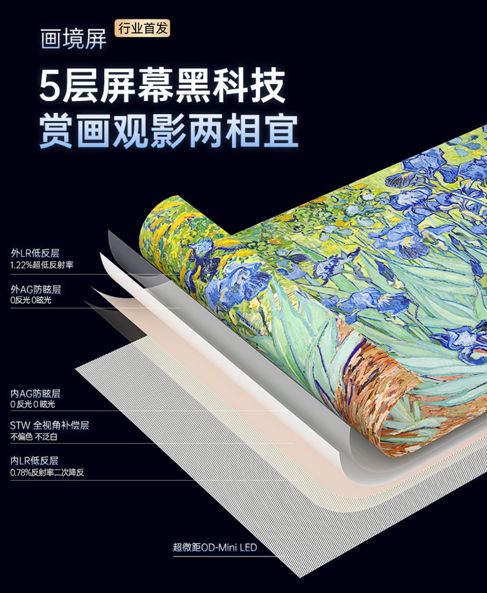 在屏幕端,创维Q7H将广受好评的「极黑广角类纸屏」升级为全新「画境屏」。新一代「哑光屏显Pro」技术叠加双层LR低反层与AG25防眩层,可大幅削弱日光反光与室内光源的眩光干扰,使环境光反射降低60%,达成“0反光0眩光”的出色观感;新增的STW全视角补偿层,更能确保侧视画面色彩稳定,从侧面看去也不会偏色,满足全家人多角度观影的需求。