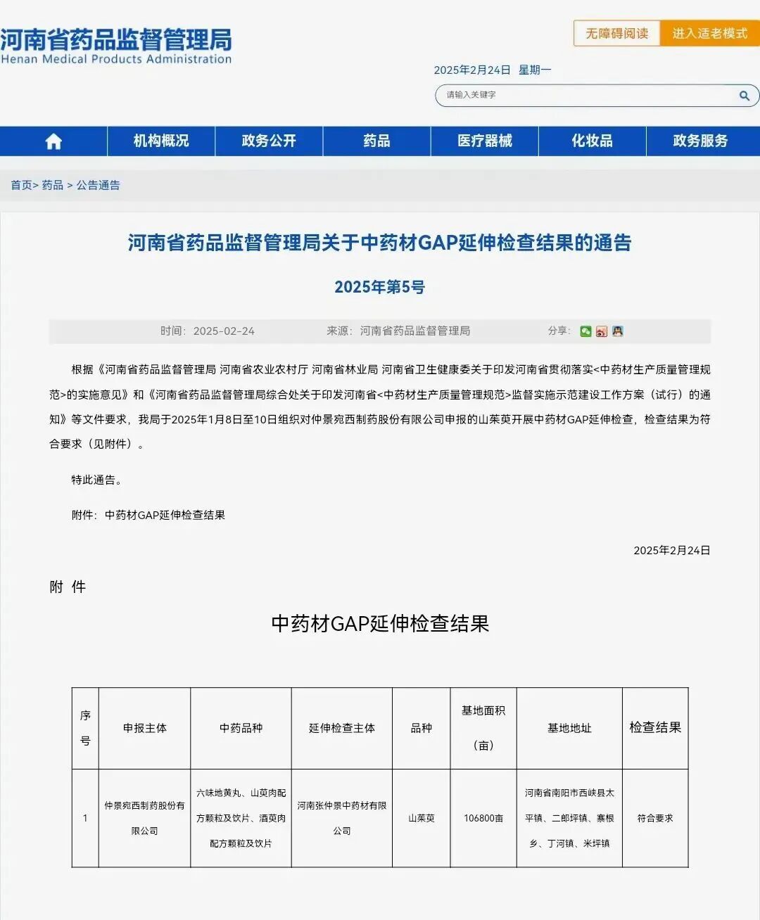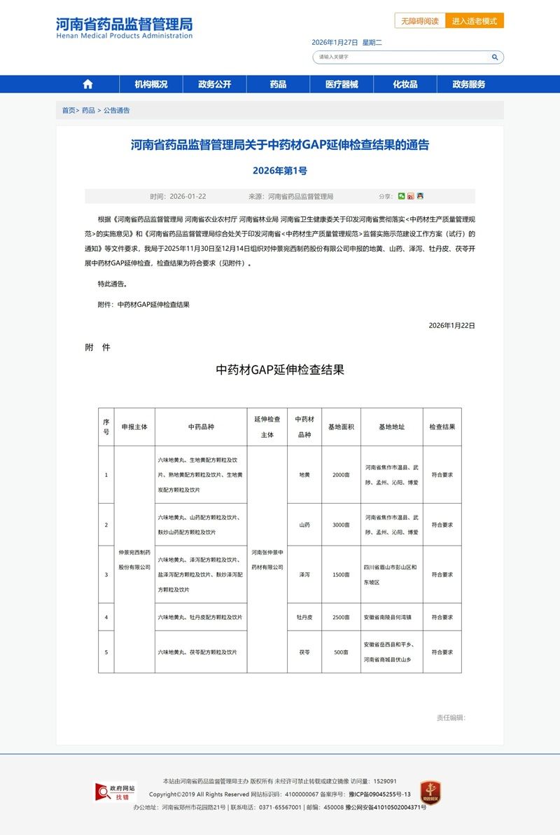 春潮涌动,捷报频传。1 月 22 日,河南省药品监督管理局官网发布通告,仲景宛西制药地黄、山药、泽泻、牡丹皮、茯苓五大中药材,经延伸检查全部符合新版 GAP 要求。加之此前通过检查的山茱萸,企业六味地黄丸所用六种组方药材实现 GAP 延伸检查 “全满贯”,这份沉甸甸的硕果,是对企业二十品质坚守的权威认可。