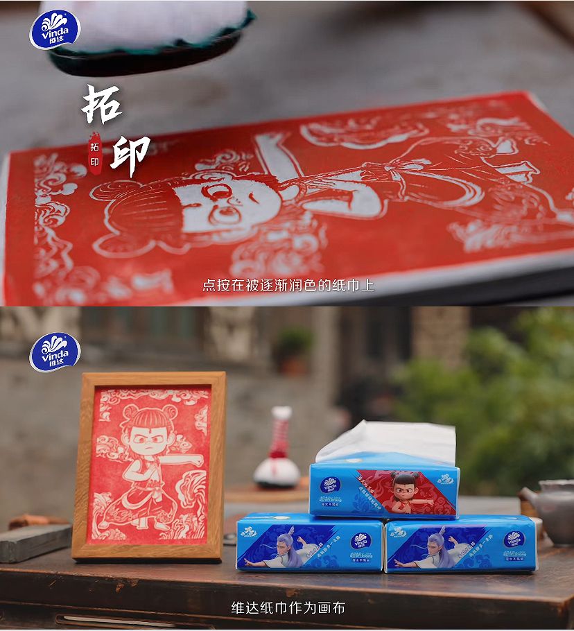 2025年5月,维达再度创新,携手动画IP“哪吒”,将另一项古老技艺——非遗拓印推至台前。通过将拓印技艺与中国传统神话结合,维达不仅让沉寂的古老技艺焕发出新时代的活力,更借助亲子互动拓印体验,让“韧性”的品牌理念与“坚韧不拔”的文化精神在家庭场景中悄然传递。