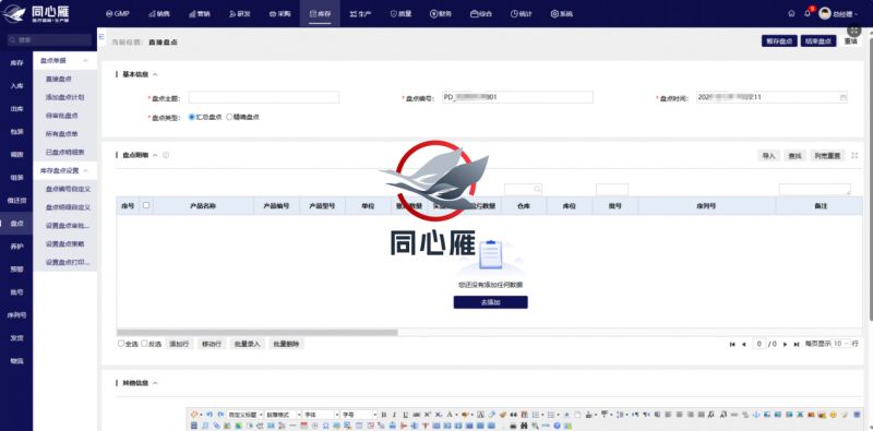 在采购环节,系统基于生产计划、库存需求与采购周期,自动生成采购订单,精准管控采购数量、供应商资质、物料批次与交货期,优先匹配具备合规资质的供应商资源。采购物料入库时,自动关联采购订单、质检流程与供应商资质文件,严格核查物料批次、有效期、质量证明,确保物料质量达标、来源可溯;入库数据实时同步至库存与财务模块,库存自动更新并标注存储要求,财务部门据此生成应付账款,实现采购业务、合规核查与财务核算的同步联动。