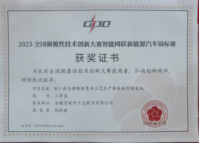 京碳号与隶属于国务院国资委的建筑材料工业技术情报研究所签署了产学研一体化的技术合作协议,扎根安徽。为发挥大院大所的科技优势,双方共建公共研发技术平台,提高循环工业的核心竞争力。在此基础上,双方历时5年基于RCT大宗固废处理技术,衍生出利用废旧电池拆解回收提锂后的磷铁渣,循环再生制备再生新能源电池正极前驱体—磷酸铁。该技术生产的的磷酸铁,在国内头部电池企业进行电池生产,装机测试后,效果获得一致好评。其关键性指标如:磁性物质含量、铝含量、钛含量基于大宗固废除杂积累的经验,突破了行业关键技术壁垒。该技术于25年下半年参与科技部创设的全国颠覆性技术创新大赛智能网联新能源汽车锦标赛,历时半年,披荆斩棘获得全国二等奖。获得了行业专家和头部企业的肯定。