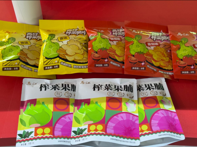 此外,榨菜集团大胆突破品类边界,推出三款概念新品:高纤榨菜脆片、榨菜果脯与胭脂萝卜果汁。这些产品不仅颠覆传统形态,更以健康营养为核心——高纤、低负、天然花青素,旨在为消费者提供兼具风味与活力的新选择。这一系列创新,重新定义榨菜的未来,向健康化、零食化、时尚化升级。