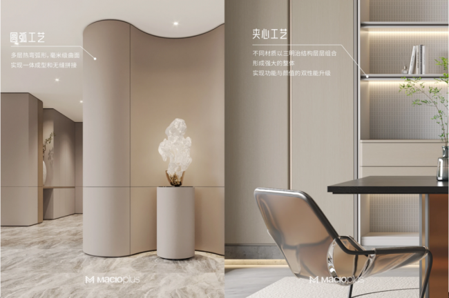 例如圆弧工艺采用多层热弯弧形技术,打造毫米级曲面,实现柜体一体成型与无缝拼接,消解传统棱角的生硬感;海棠角工艺以45°斜边拼角搭配侧包顶/底板设计,在呈现纤薄视觉效果的同时,大幅提升结构稳定性;隐孔工艺则通过四面隐形扣合技术,将孔位完全隐藏,让柜体实现严丝合缝的极致平整。此外,2.7m一门到顶的超高工艺,打破传统拼接的割裂感,塑造出顶天立地的高级空间气场;悬挑工艺以隐藏式设计保障稳固承重,营造出轻盈悬浮的空间美学。