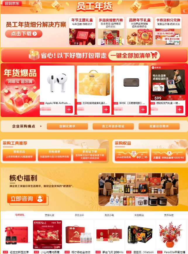 在政策引导与市场需求双重驱动下,企业福利采购、年货礼赠等需求集中释放,京东企业购针对员工福利、商务礼赠等高频场景,打造了年货节场景解决方案,将京东平台的标准化产品能力,转化为“省心、高效、有温度”场景化服务,汇聚成“年货节采购工具包”,显著降低企业数字化采购门槛,实现从单纯“卖商品”到深度“卖服务”的转型。