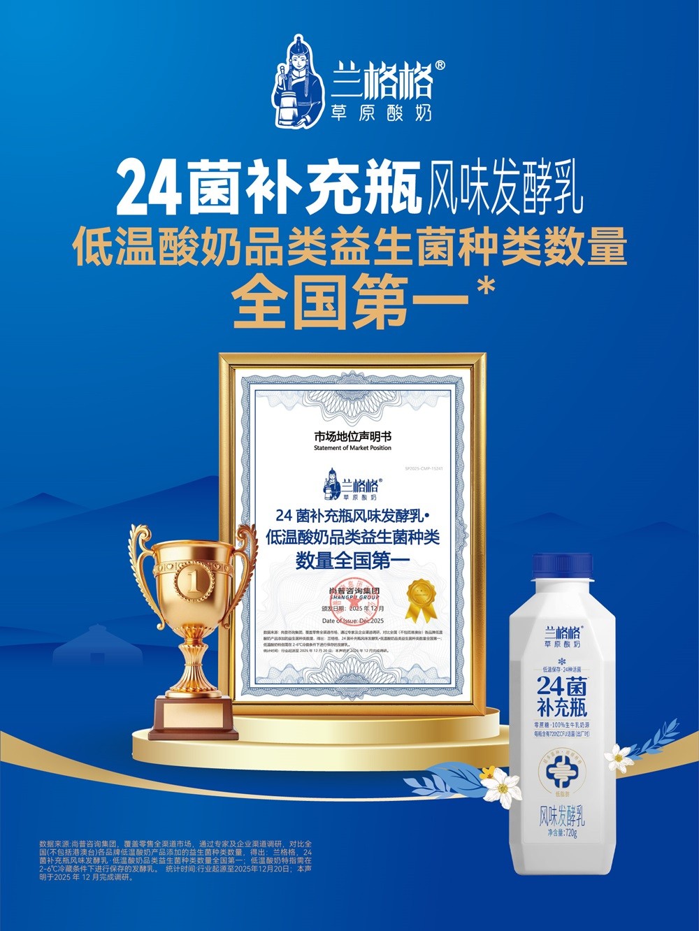 据悉,兰格格是专注草原酸奶生产的规模化乳制品企业,已构建以自建生态牧场、自建草原工厂、内蒙古草原酸奶技术研发中心、易宁物流冷链配送系统为核心的产业布局,其坚持的“草原奶、草原菌、草原产、草原供”产品策略,为益生菌酸奶产品的研发与生产提供了坚实产业支撑,24 菌补充瓶风味发酵乳的推出,正是其在低温酸奶益生菌领域技术研发的重要成果。