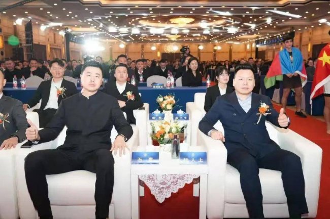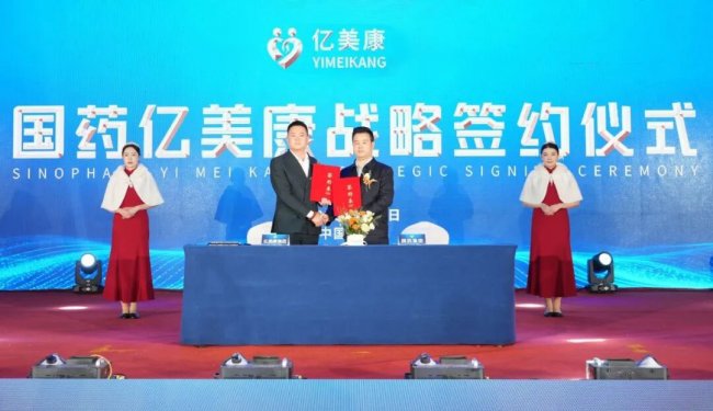 新领航集团、国药亿美康代表人舒洪亮与武林风(海南)传媒有限公司董事长石青进行YFU战略签约仪式。