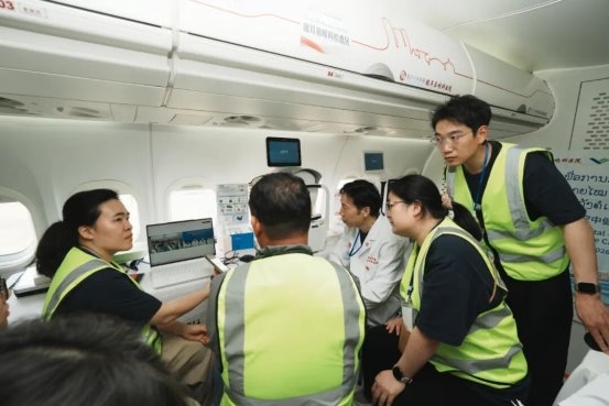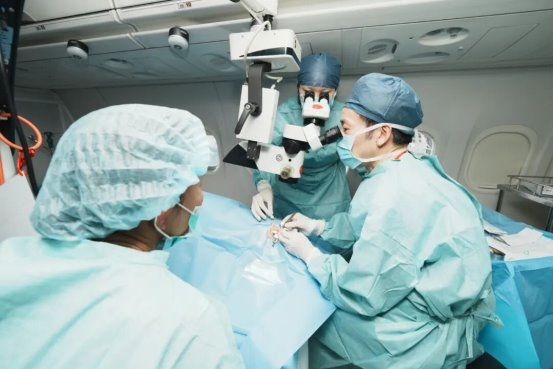 这架配备眼科手术显微镜、耳鼻喉内窥镜及数字化诊疗设备的飞机医院,以万象瓦岱国际机场为枢纽,与玛霍索综合医院联动构建空中移动诊疗平台。疑难病例经筛查后,可直接上飞机医院开展会诊与手术。周行涛院长带领团队完成首批海外眼科手术,同时飞机上搭载的高端设备也用于当地医院联合门诊。