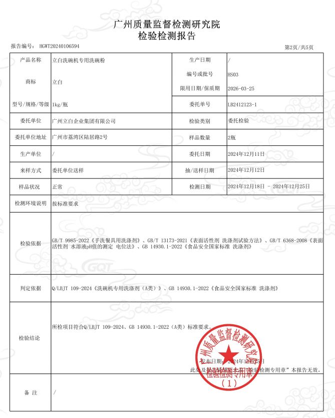 当安全标准提升至可接触食品的A类等级,意味着所有注重健康品质的家庭人群对产品品质的可靠性产生更高的期待。为进一步验证立白智净洗碗机专用天然洗碗粉的 A 类安全属性与全食品用成分优势,品牌特别委托国际权威检测机构 SGS 开展专项检测,重点针对食品安全国家 A 类标准核心管控物质进行全面筛查。检测项目严格覆盖砷、铅等重金属,甲醇、甲醛、1,4 - 二噁烷等有害化学残留,以及菌落总数、大肠菌群等微生物指标,所有检测均依据《食品安全国家标准洗涤剂》等权威标准执行,检测结果均符合 A 类食品标准严苛要求。这份 SGS 检测报告从原料安全性、成分纯净度、使用无残留等多维度,实证立白智净天然洗碗粉 “全食品用成分、0 添加有害化学物质、无残留” 的核心优势,让产品通过 A 类标准认证的结论更具说服力,为家庭餐具清洁安全再添一道坚实保障。