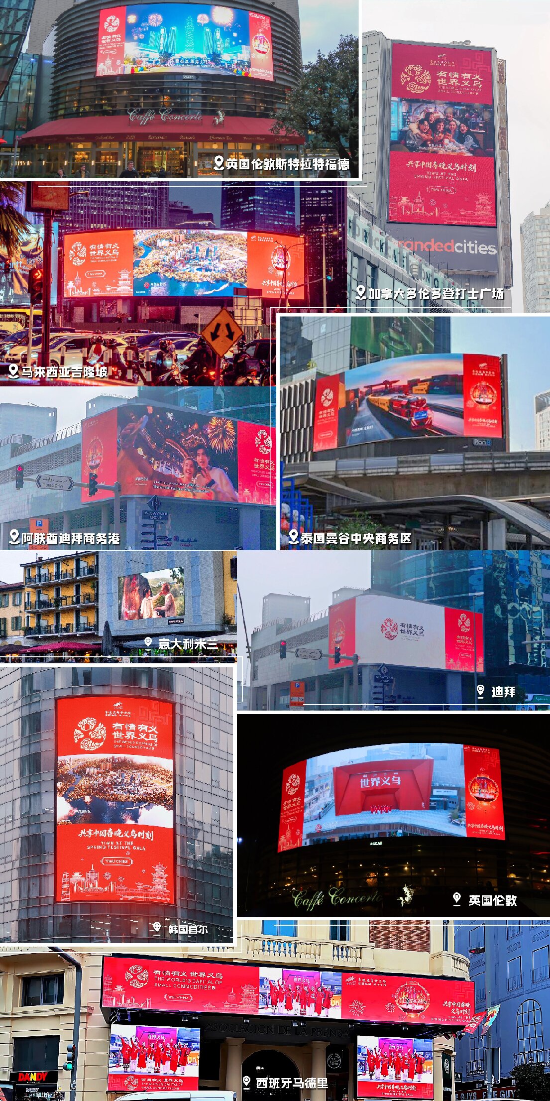 美国纽约时代广场、加拿大多伦多登打士广场、阿联酋迪拜CBDBay、法国巴黎歌剧院大街、意大利米兰纳维利、英国伦敦斯特拉特福德市、韩国首尔明洞乙支路、马来西亚吉隆坡燕美路等20个国家和地区核心商圈的户外大屏,同步滚动播放义乌城市形象宣传片及央视2026年春晚义乌分会场邀约海报。
