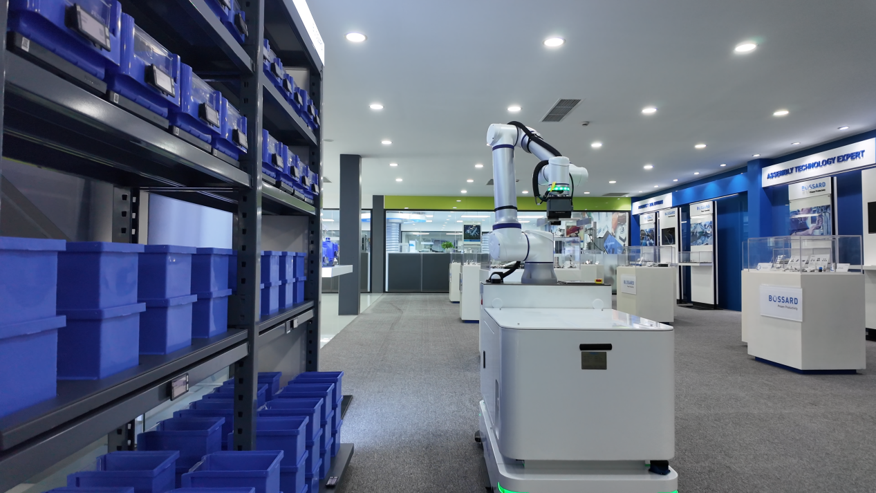 复合机器人实时接收指令,自主导航至货架区,通过扫码精准识别物料位置,抓取对应料盒,沿最优路径送达工位、放置指定库位,系统自动确认补货完成,机器人返回等待区。