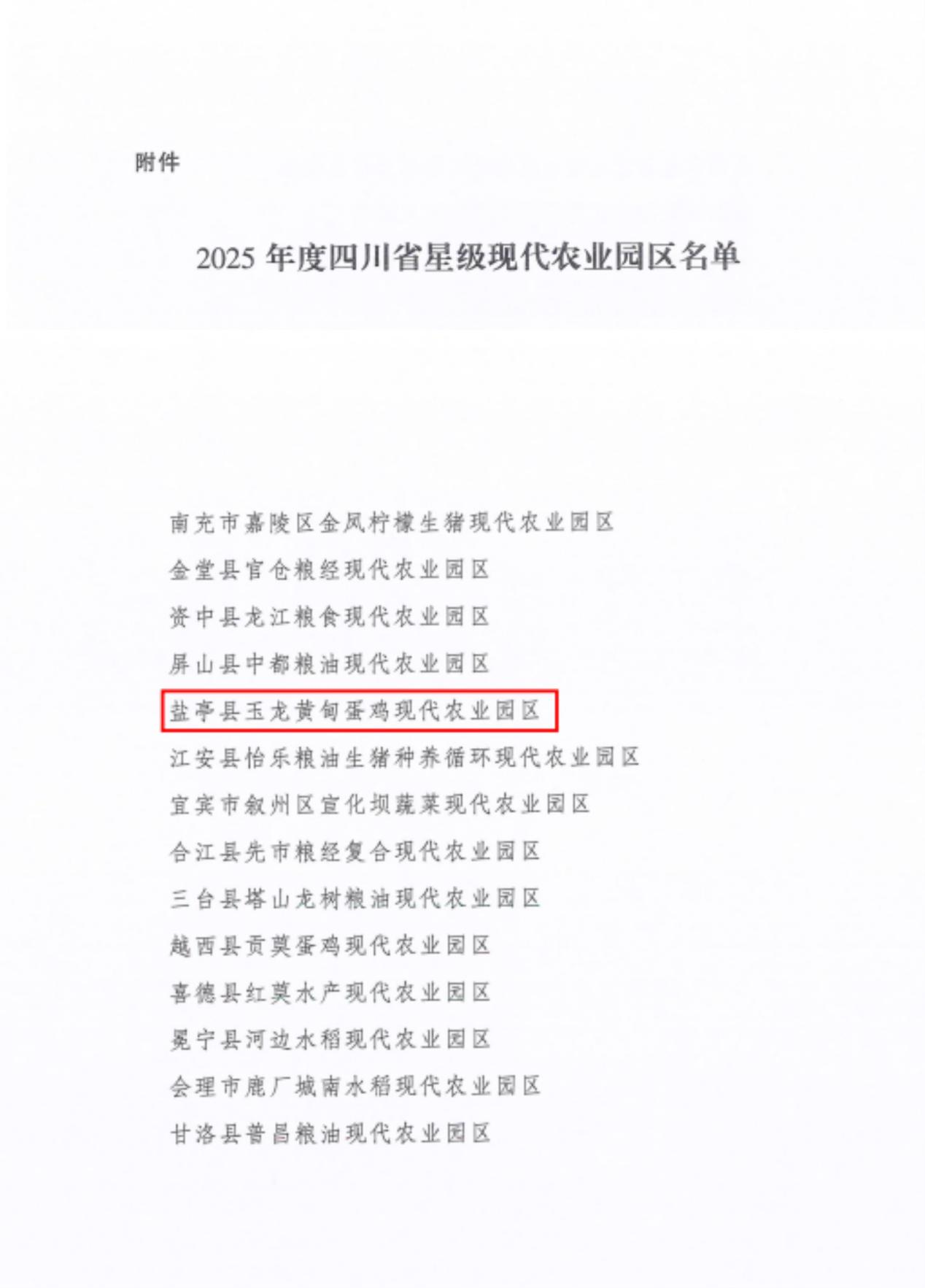 近日,四川省人民政府发布了《关于公布2025年度四川省星级现代农业园区的通知》,盐亭县玉龙黄甸蛋鸡现代农业园区凭借全产业链建设、联农带农效益、高质量绿色发展实践等成果,成功获评“四川省三星级现代农业园区”。这是继2022年获评市级五星级现代农业园区后,该园区在省级层面获得的又一重要认定,标志着其在蛋鸡产业标准化、规模化、品牌化发展道路上迈上新台阶。
