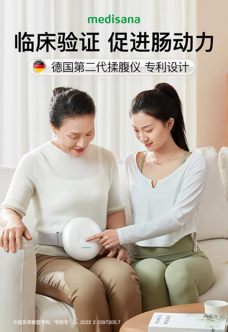该揉腹仪联合福建省中医药科学院研发,拥有三大对症模式,可模拟专业医学手法,顺时针促进排便、逆时针温和温补。其150mm大直径按摩盘可覆盖腹部10大核心穴位,搭配4cm加高按摩头与纯铜大扭力机芯,按摩力度可深层渗透,有效促进肠动力、改善胀气、通排宿便。更值得一提的是,临床验证显示medisana马德保康揉腹仪不仅可提升肠胃蠕动、改善腹部气血循环,其按摩热敷功能还可以缓解女性经期不适。