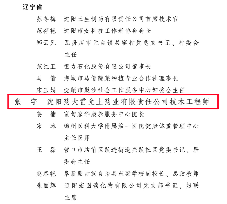 近日,中华全国妇女联合会公布2025年度全国三八红旗手表彰名单,沈阳药大雷允上药业有限责任公司技术工程师张宇凭借在医药研发领域的卓越贡献与巾帼担当成功上榜。