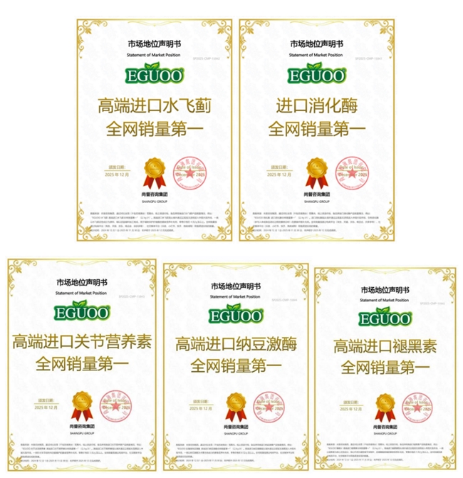 凭借卓越的研发实力与产品品质,EGUOO在全球健康营养领域不断获得权威认可,荣获了2025年度TITAN健康金奖,成功跻身天猫国际2025亿元俱乐部,并获得知名咨询机构尚普咨询“进口消化酶全网销量第一”“高端进口水飞蓟全网销量第一”“高端进口关节营养素全网销量第一”“高端进口纳豆激酶全网销量第一”“高端进口褪黑素全网销量第一”等市场认证地位。值得一提的是,EGUOO 全线产品通过美国 FDA、USP 等权威认证,以严苛的质量标准服务全球用户,致力于为全球消费者提供高品质的精准营养健康产品。
