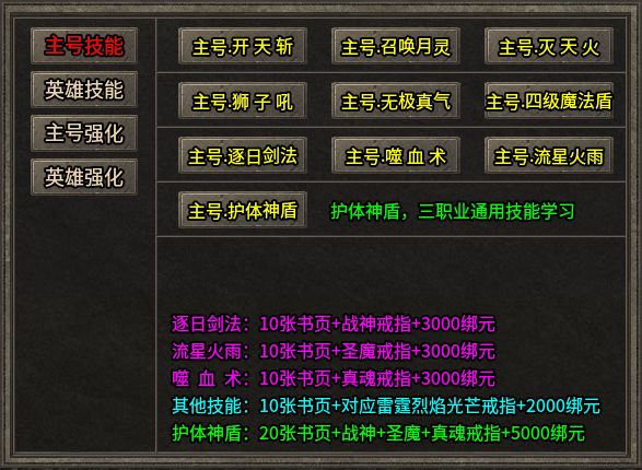 技能获取方式也回归了最朴素的逻辑:打怪掉落,兑换习得。通过打怪获得书页和指定装备,再消耗元宝即可兑换职业技能。三职业通用的“护体神盾”作为打BOSS和PK的保命神技,必须优先安排,二十张书页、战神/圣魔/真魂戒指各一、五千绑定元宝,就能收入囊中。技能到达3级后,还可继续消耗书页和元宝强化等级,威力层层攀升。这套系统最贴心的一点是:需要的装备都会明明白白列出来,只要平时打怪多留个心眼,别手滑把关键装备回收了,早晚都能毕业。