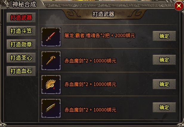 在武器打造中,屠龙、霸者、嗜魂三件装备是关键素材,各准备两件,再加2000元宝,就能合成赤血魔剑——这把强力过渡武器,持有两把后还可进一步合成三职业毕业武器:紫金嗜魂法杖、赤金逍遥扇、黄金屠龙。从名字到造型,都透着满满的牌面。