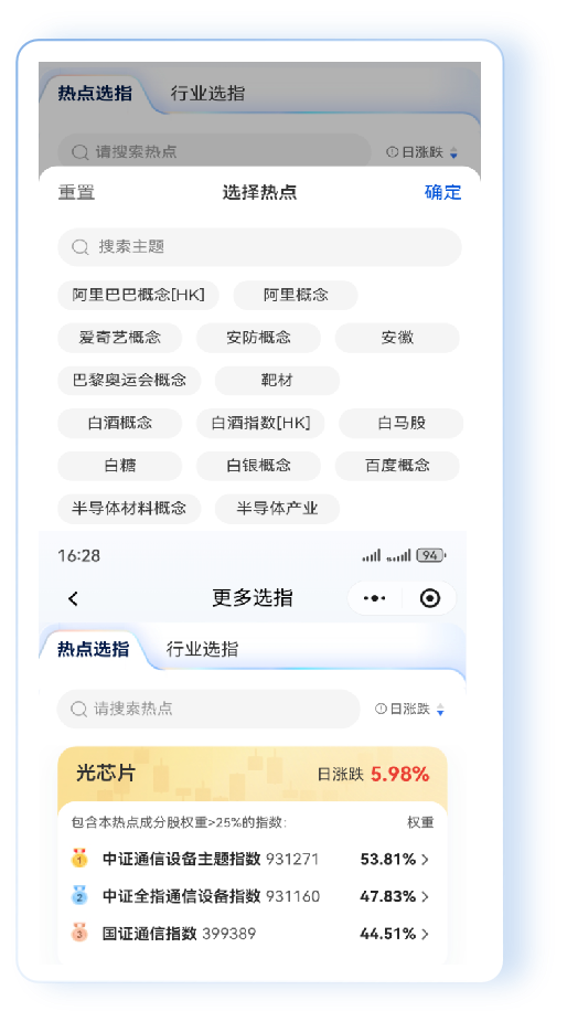 在“找”的环节,平台创新性推出热点选指+行业选指功能,投资者仅需输入关键词,即可在全市场范围内快速匹配相关指数。值得关注的是,该平台的查询范围不局限于南方基金自家产品,而是可以一站式地呈现全市场的优质标的,帮助投资者在海量的指数和产品中看懂机会、精准锁定目标。