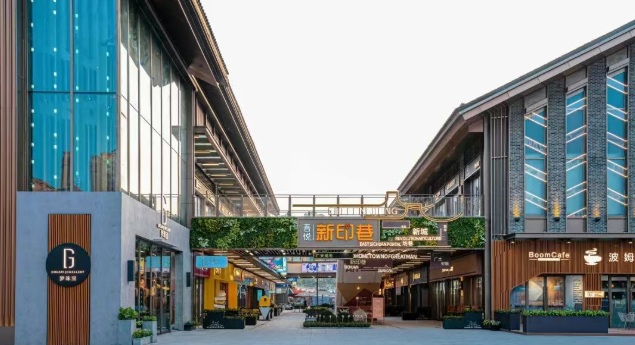 “印巷”深入挖掘城市历史脉络与文化符号,将商业运营与在地文化融合。街区采用开放式布局,秉持“小尺度、高质感”设计原则,通过错落店铺排布、绿意环绕路径与露天座区,营造步步皆景的体验。沿街外摆区将咖啡座、花架与手作展台自然融入;墙面涂鸦、潮流雕塑与创意挂饰点缀其间。城市文化符号被融入建筑立面与景观设计,使街区成为可感知的文化载体。