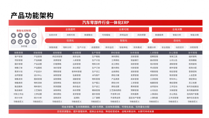 在全球汽车产业电动化、智能化、网联化、低碳化深度融合的浪潮下,汽车零部件行业正经历从“幕后配套”到“技术策源地”的角色跃迁。传统机械件向“软硬一体化”部件转型,产品复杂度呈指数级增长,主机厂对交付时效、质量追溯、成本控制的要求愈发严苛,叠加供应链自主可控、绿色合规等政策导向,行业管理迎来前所未有的挑战。数智化转型已不再是选择题,而是汽车零部件企业构筑核心竞争力的必答题。然而,多数企业仍深陷“数据孤岛、流程割裂、响应迟缓”的管理困境,难以适配行业变革节奏。智邦国际一体化ERP立足行业特性,以全链路一体化设计为核心,打通研发、采购、生产、供应链、财务、质量全业务场景,为汽车零部件企业提供从基础管理到战略赋能的数智化解决方案,助力企业破解痛点、适配政策、抢抓市场机遇,实现高质量发展。