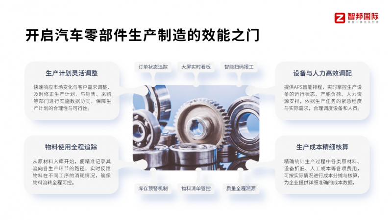 智邦国际一体化ERP通过全链路数智化赋能,帮助汽车零部件企业实现管理效率、成本管控、合规风险、决策能力、组织能力的全方位升级,推动数智化价值落地。在管理效率提升方面,通过数据一体化与流程自动化,消除人工重复工作,提升全业务链协同效率,大幅缩短生产排程、采购计划编制、财务核算的时间,降低管理人力成本,彻底解决流程割裂问题,提升生产、采购、供应链等环节响应速度,缩短紧急订单交付周期,提高客户满意度。